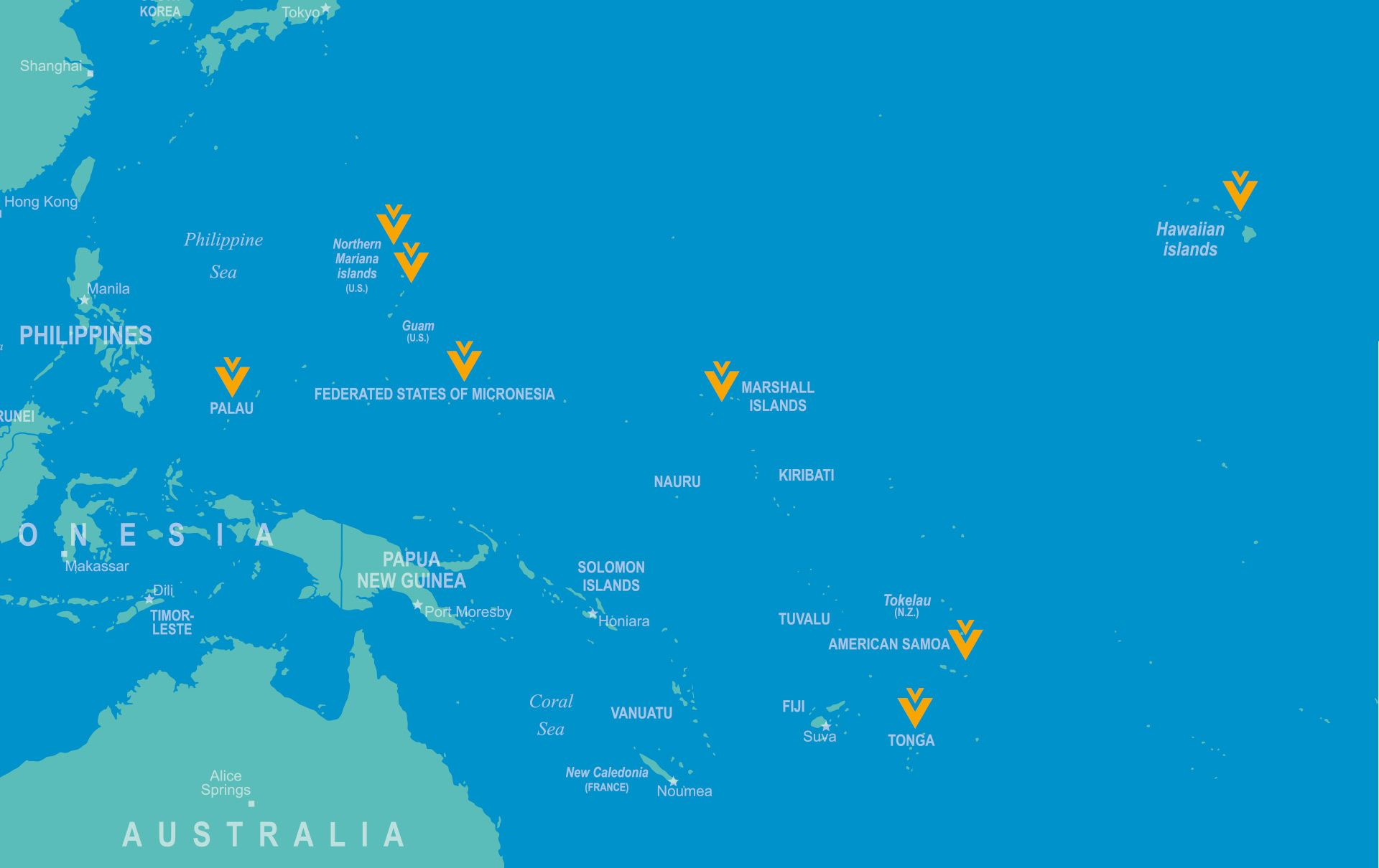 OAHU – KAUAI – MAUI – HAWAII ISLAND – AMERICAN SAMOA – MAJURO – KWAJALEIN – EBEYE – CHUUK POHNPEI – KOSRAE – YAP - GUAM – PALAU – TONGA – CNMI